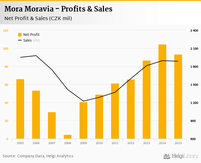 Mora Moravia made a net profit of CZK 93.4 mil in 2015, down 10.5% compared to the previous year. Total sales reached CZK 1,884 mil, which is down 0.545% when compared to the previous year.