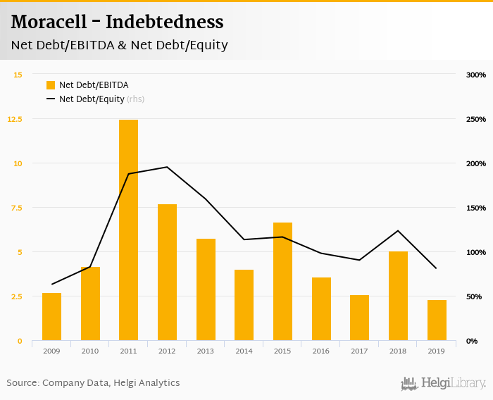Moracell's net debt stood at CZK 136 mil and accounted for 80.6% of equity at the end of 2019. The ratio is down 42.7 pp compared to the previous year.
