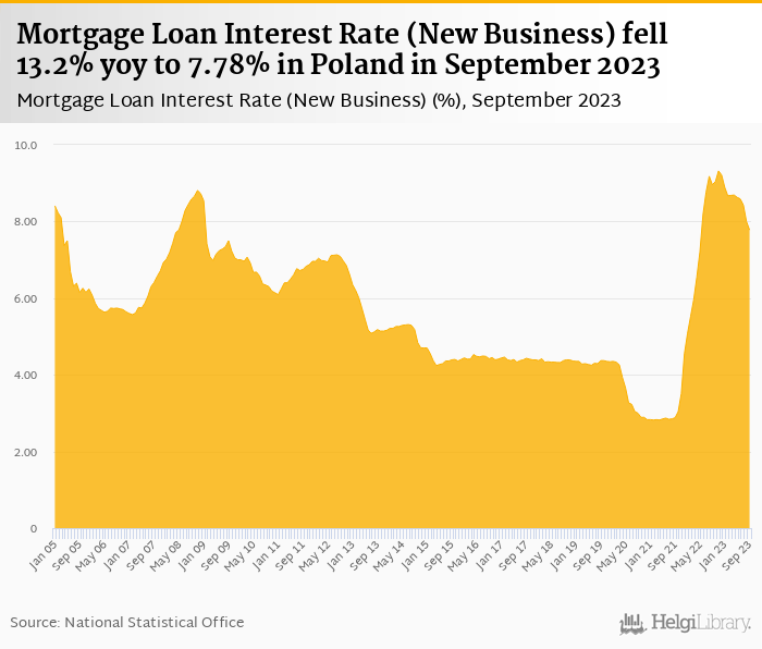 Average interest rate on new mortgage loans granted fell 13.2% yoy to 7.78% in Poland in September 2023, according to the National Statistical Office. This is 2.75% less than in the previous month.