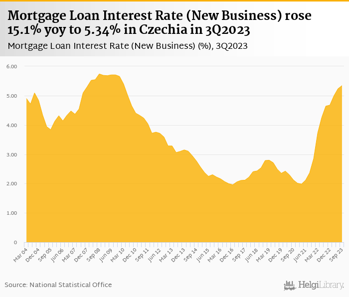 Average interest rate on new mortgage loans granted rose 15.1% yoy to 5.34% in Czechia in 3Q2023, according to the National Statistical Office. This is 2.08% more than in the previous quarter.