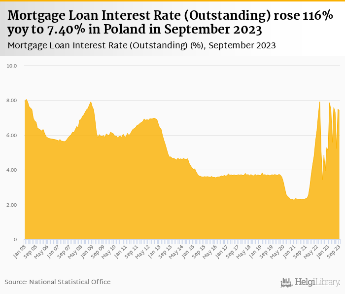 Average mortgage loan interest ratein the local currency rose 116% yoy to 7.40% in Poland in September 2023, according to the National Statistical Office. This is 1.33% less than in the previous month.