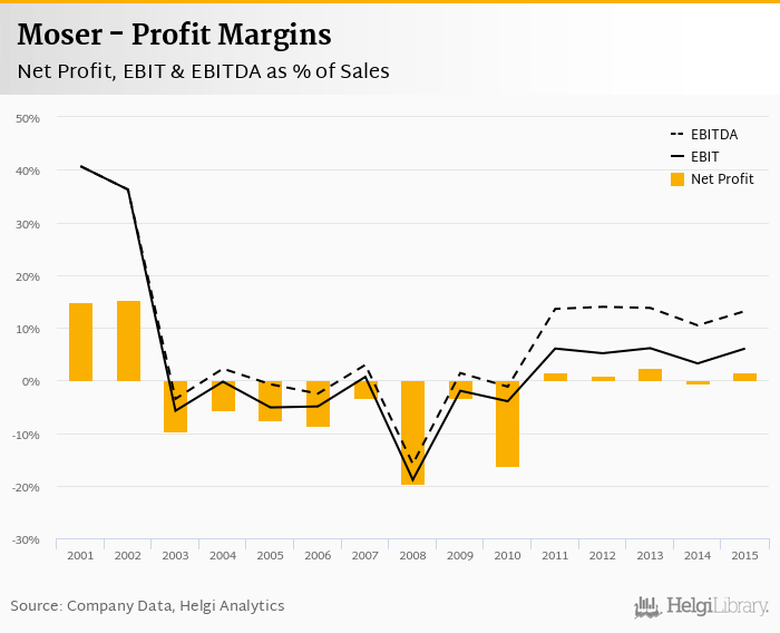 Moser made a net profit of CZK 6.03 mil with revenues of CZK 391 mil in 2015, up by 354% and up by 8.13%, respectively, compared to the previous year.