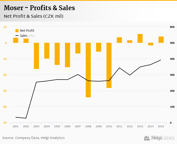 Moser made a net profit of CZK 6.03 mil in 2015, up 354% compared to the previous year. Total sales reached CZK 391 mil, which is up 8.13% when compared to the previous year.