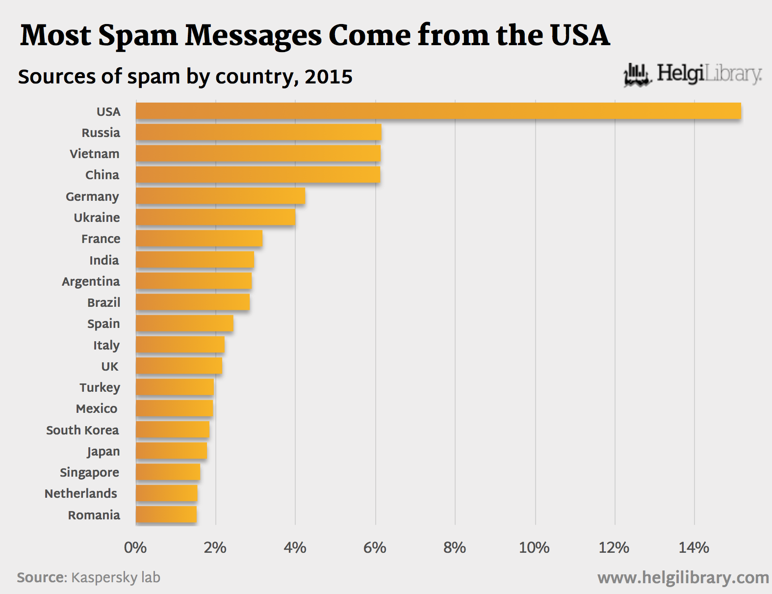 In 2015, the United States was the top source of the majority of the spam emails filling up your inbox with more than 15% of global spam originating there. Russia, Vietnam and China followed with 6% each.