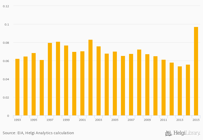 Motor gasoline consumption as a share of worldwide consumption rose 74.0% to 0.097% in Slovakia in 2015, according to EIA.