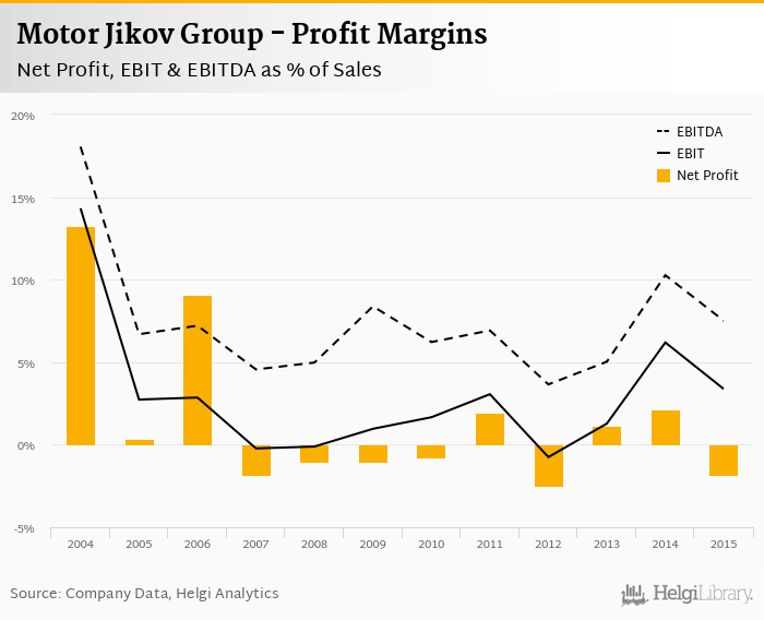 Motor Jikov Group made a net profit of CZK -28.4 mil with revenues of CZK 1,551 mil in 2015, down by 186% and up by 2.13%, respectively, compared to the previous year.