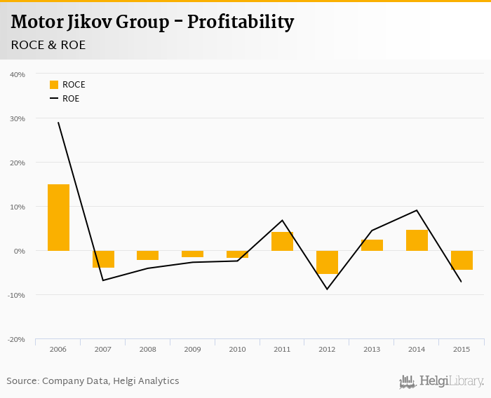 As far as Motor Jikov Group's peers are concerned, Varroc Lighting Systems Czech Republic generated ROE of 28.0% and ROCE of 17.8% in 2015. Automotive Lighting's profitability reached 46.9% and 47.7%, respectively. Continental Automotive Czech Republic operated with 7.08% and 2.02% returns in 2015.