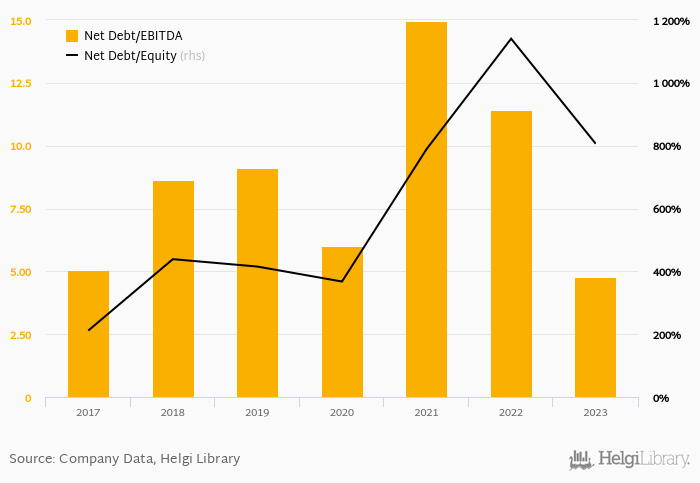 Net debt to EBITDA was calculated at 4.78x at the end of the year. ERROR: A non-numeric value encountered That is up from 8.65x seen in 2018. The ratio reached a high of 15.0x in 2021 and a low of 4.78x in 2023.