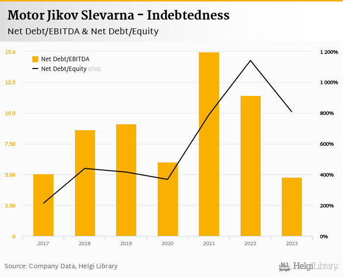 Motor Jikov Slevarna's net debt stood at CZK 205 mil and accounted for 806% of equity at the end of 2023. The ratio is down 334 pp compared to the previous year.