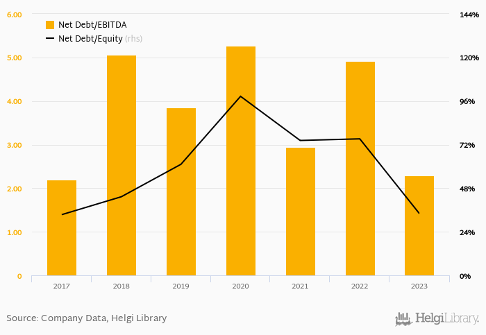 Historically, the firm’s net debt to equity reached a high of 98.6% in 2020 and a low of 33.4% in 2017 between 2017 and 2023. The average for the last five years was 68.6%.