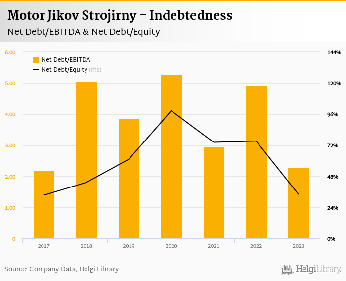 Motor Jikov Strojirny's net debt stood at CZK 126 mil and accounted for 34.0% of equity at the end of 2023. The ratio is down 41.2 pp compared to the previous year.