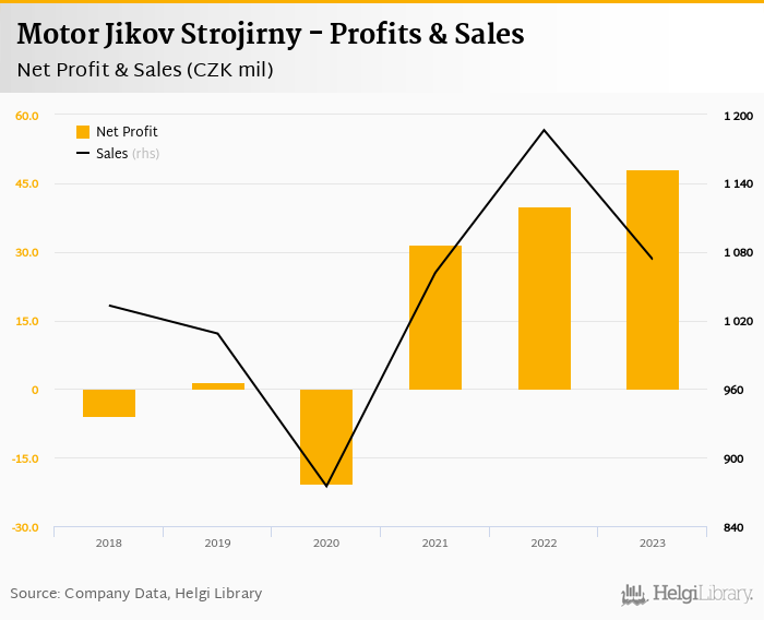 Motor Jikov Strojirny made a net profit of CZK 48.0 mil in 2023, up 20% compared to the previous year. Total sales reached CZK 1,073 mil, which is down 9.54% when compared to the previous year.