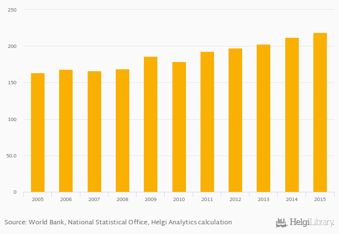 Historically, motor vehicles per 1,000 people in Serbia reached an all time high of 219 vehicles in 2015 and an all time low of 163 vehicles in 2005. When compared to Serbia's main peers, motor vehicles per 1,000 people in Bosnia and Herzegovina amounted to 241 vehicles, 394 vehicles in Croatia, 378 vehicles in Hungary and 281 vehicles in Romania in 2015.