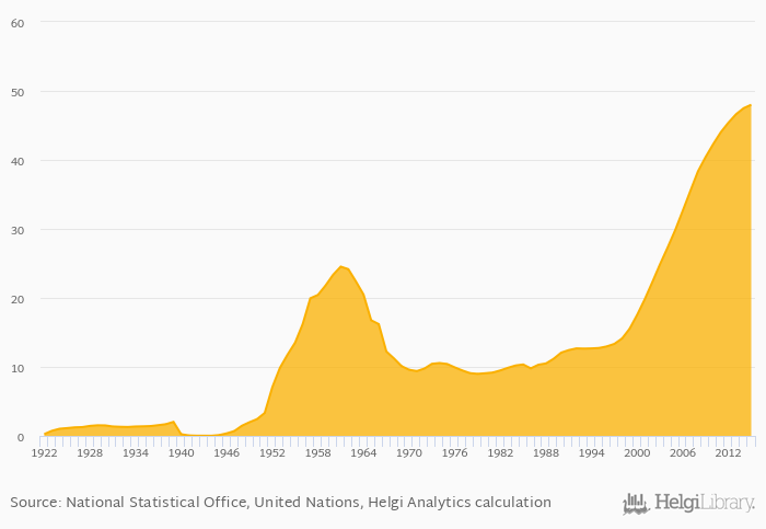 Historically, motorcycles per 1,000 people in Finland reached an all time high of 48.0 vehicles in 2015 and an all time low of 2.43 vehicles in 1950.