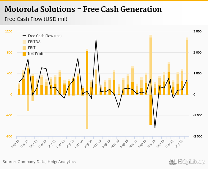 Motorola Solutions made a net profit of USD 244 mil with revenues of USD 2,377 mil in 4Q2019, down by 42.3% and up by 5.46%, respectively, compared to the previous year. This translates into a net margin of 11.0%.