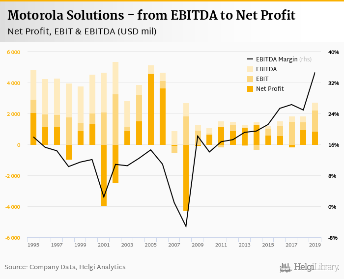 Motorola Solutions made a net profit of USD 868 mil with revenues of USD 7,887 mil in 2019, down by 10.1% and up by 7.41%, respectively, compared to the previous year. This translates into a net margin of 11.0%.