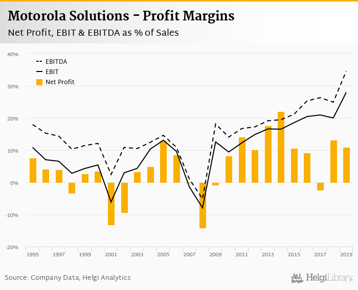 Motorola Solutions made a net profit of USD 868 mil with revenues of USD 7,887 mil in 2019, down by 10.1% and up by 7.41%, respectively, compared to the previous year.