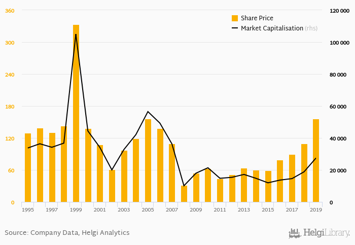 Since the end of 2014, stock has appreciated by 161% implying an annual average growth of 21.1% In absolute terms, the value of the company rose by USD 12,730 mil.