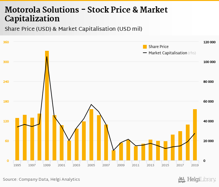 Motorola Solutions stock traded at USD 156 per share at the end 2019 implying a market capitalization of USD 27,474 mil.