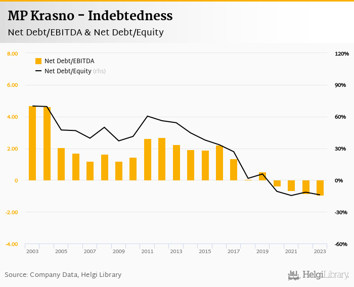 MP Krasno's net debt stood at CZK -115 mil and accounted for -14.0% of equity at the end of 2023. The ratio is down 2.56 pp compared to the previous year.