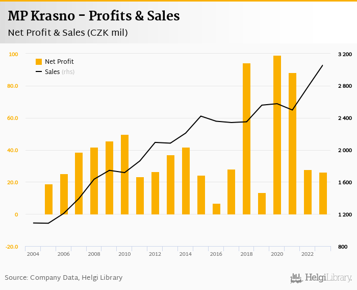 MP Krasno made a net profit of CZK 26.1 mil in 2023, down 5.58% compared to the previous year. Total sales reached CZK 3,058 mil, which is up 10% when compared to the previous year.