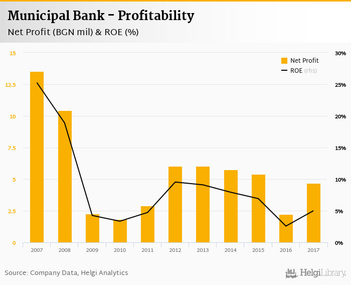 Comparing Municipal Bank with its closest peers, DSK Bank generated a net profit of BGN 285 mil with ROE of 17.7% in 2017, United Bulgarian Bank netted BGN -47.4 mil (ROE of -4.55%) and Raiffeisenbank Bulgaria announced a net profit of BGN 137 mil implying ROE of 14.9%.