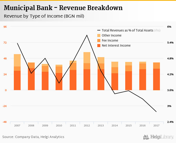 Comparing Municipal Bank with its closest peers, DSK Bank generated total revenues of 5.78% of assets in 2017, United Bulgarian Bank operated with 4.70% revenue margin and Raiffeisenbank Bulgaria produced total income worth 4.37% of assets.