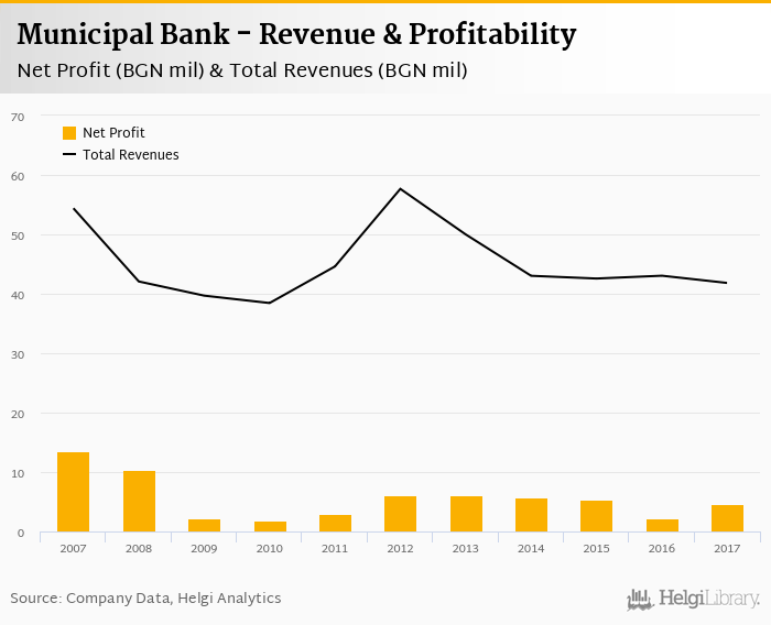 Comparing Municipal Bank with its closest peers, DSK Bank generated a net profit of BGN 285 mil with revenues of BGN 715 mil in 2017, United Bulgarian Bank netted BGN -47.4 mil (revenues of BGN 346 mil) and Raiffeisenbank Bulgaria announced a net profit of BGN 137 mil (revenues of BGN 314 mil).