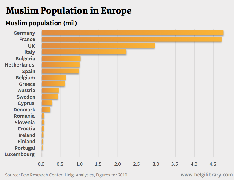 The Muslim share of Europe’s total population has been increasing steadily. The top countries of origin of Muslims in Western Europe are Pakistan, Turkey and the Maghreb countries (Morocco, Algeria, Tunisia).