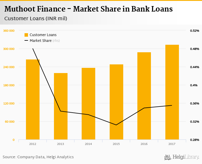 Muthoot Finance accounted for 0.355% of all customer loans issued in India at the end of 2017. Historically, the bank’s market share in customer loans reached an all time high of 0.480% in 2012 and an all time low of 0.312% in 2015.