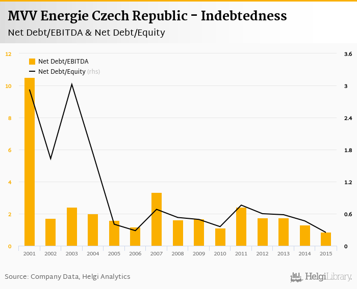 MVV Energie Czech Republic's net debt stood at CZK 639 mil and accounted for 0.249 of equity at the end of 2015. The ratio is down 0.216 pp compared to the previous year.