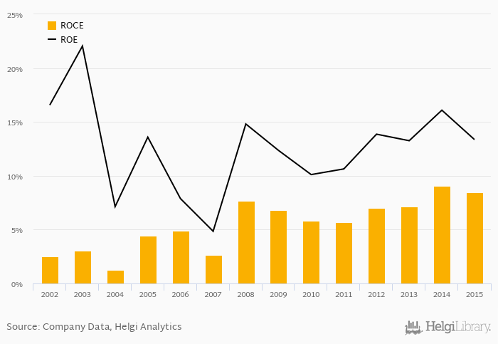 The result implies a return on equity of 13.4% and a return on invested capital of 8.45% in 2015. That is compared to an average of 13.4% and 7.47% over the last five years.