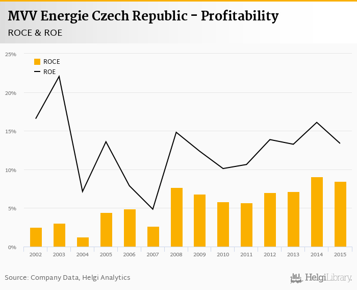 As far as MVV Energie Czech Republic's peers are concerned, E.ON Energie Czech Republic generated ROE of 20.6% and ROCE of 29.5% in 2015. CEZ's profitability reached 7.71% and 4.01%, respectively. Energeticky a prumyslovy holding operated with 18.5% and 5.67% returns in 2015.