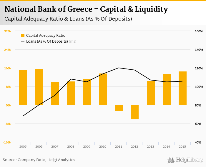 Comparing National Bank of Greece with its closest peers, Alpha Bank Group ended the year 2015 with a capital adequacy ratio at 16.8% and loans to deposits of 147%, Piraeus Bank Group with 17.5% and 130% respectively and Eurobank Group some 17.4% in terms of capital adequacy and 127% of loans to deposits at the end of 2015.