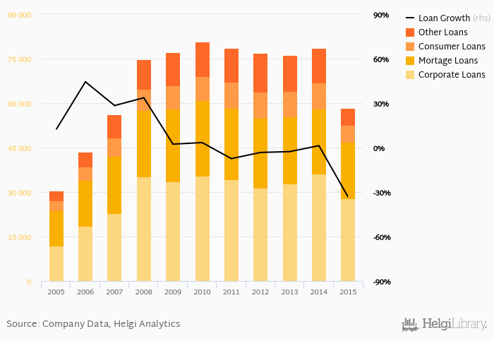 Mortgage loans represented 33.1% of the bank's loan book at the end of the year 2015, consumer further 9.62% and corporate loans 47.7% of total loans.