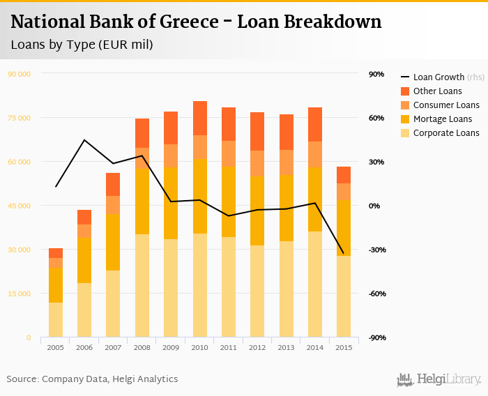 At the end of 2015, National Bank of Greece's loans accounted for 106% of total deposits and 40.8% of total assets.