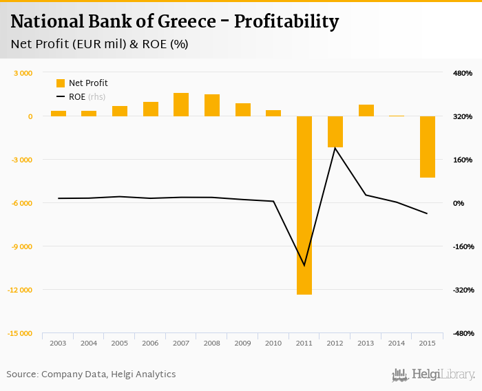 Comparing National Bank of Greece with its closest peers, Alpha Bank Group generated a net profit of EUR -1,372 mil with ROE of -16.4% in 2015, Piraeus Bank Group netted EUR -1,858 mil (ROE of -21.4%) and Eurobank Group announced a net profit of EUR -1,076 mil implying ROE of -16.0%.