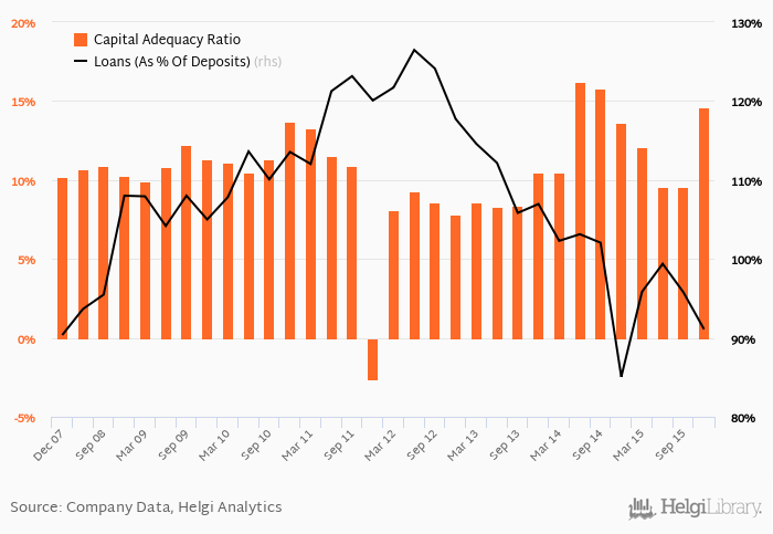 When compared to bank's main peers, Alpha Bank Group ended the fourth quarter of 2015 with a capital adequacy ratio at 16.8% and loans to deposits of 147% and Eurobank Group with 17.4% and 127% respectively.