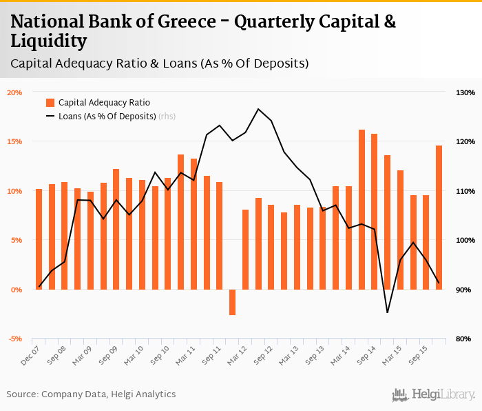 National Bank of Greece's capital adequacy ratio reached 14.6% at the end of fourth quarter of 2015, up from 9.60% when compared to the previous quarter. Historically, the bank’s capital ratio hit an all time high of 16.2% in 2Q2014 and an all time low of -2.60% in 4Q2011.