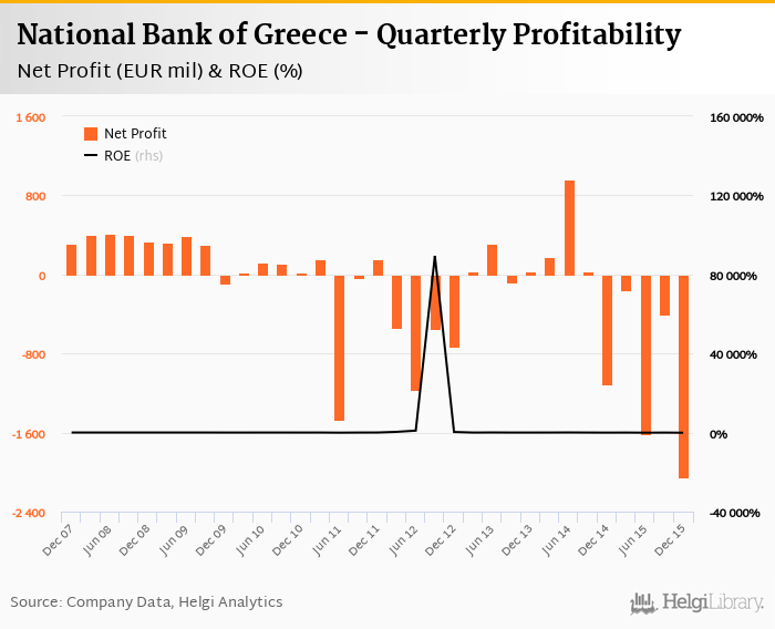 National Bank of Greece made a net profit of EUR -2,050 mil in the fourth quarter of 2015, down 84.9% when compared to the same period of last year. This implies a return on equity of -96.0%.