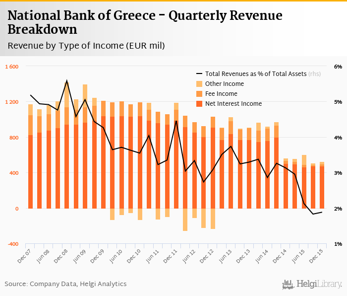 National Bank of Greece generated total banking revenues of EUR 524 mil in the fourth quarter of 2015, down 42% when compared to the same period of last year and up 3.58% when compared to the previous quarter.