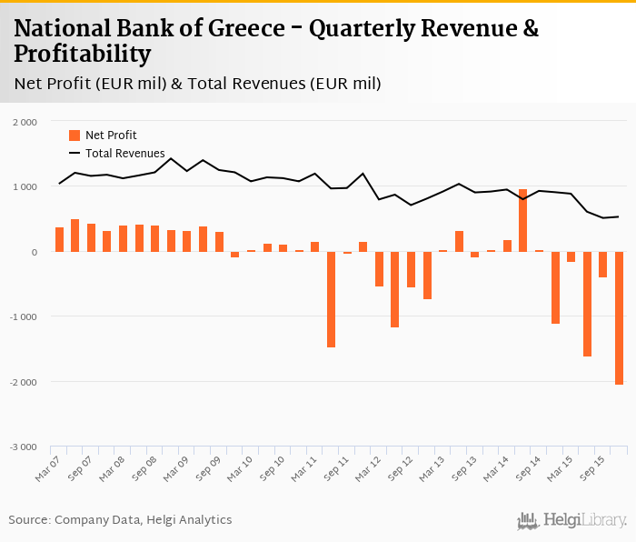 When compared to bank's main peers, Alpha Bank Group generated a quarterly net profit of EUR -622 mil with revenues of EUR 636 mil in 4Q2015, Piraeus Bank Group netted EUR -1,238 mil (revenues of EUR 605 mil) and Eurobank Group announced a net profit of EUR -175 mil (revenues of EUR 479 mil).