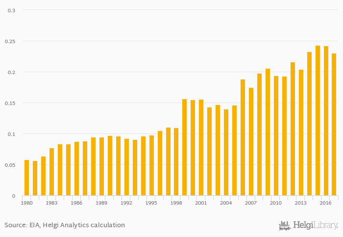 Natural gas reserves as a share of worldwide reserves fell 4.93% to 0.230% in Brazil in 2017, according to EIA.