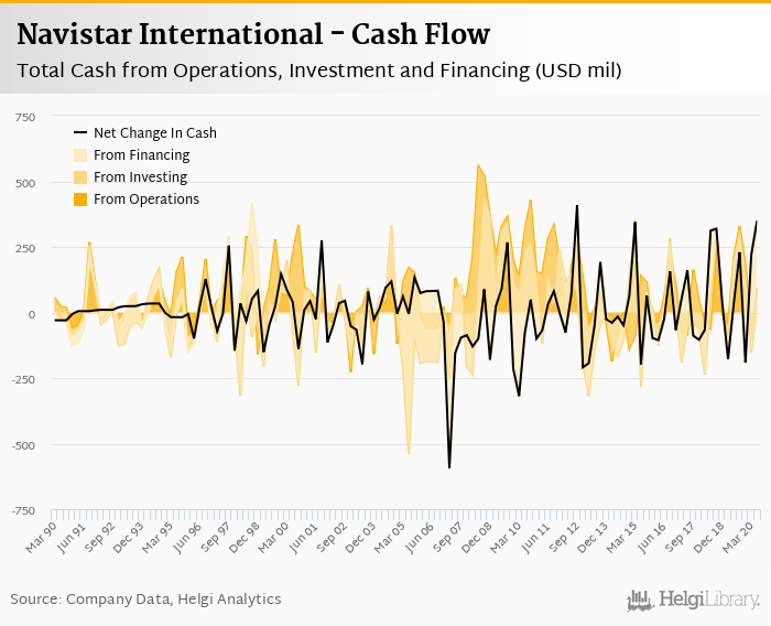 Navistar International's operating cash flow stood at USD 93.4 mil in 2Q2020, down 55.9% when compared to the previous year. Historically, between 1Q1990 - 2Q2020, the firm’s operating cash flow reached a high of USD 557 mil in 2Q2008 and a low of USD -250 mil in 1Q2007.