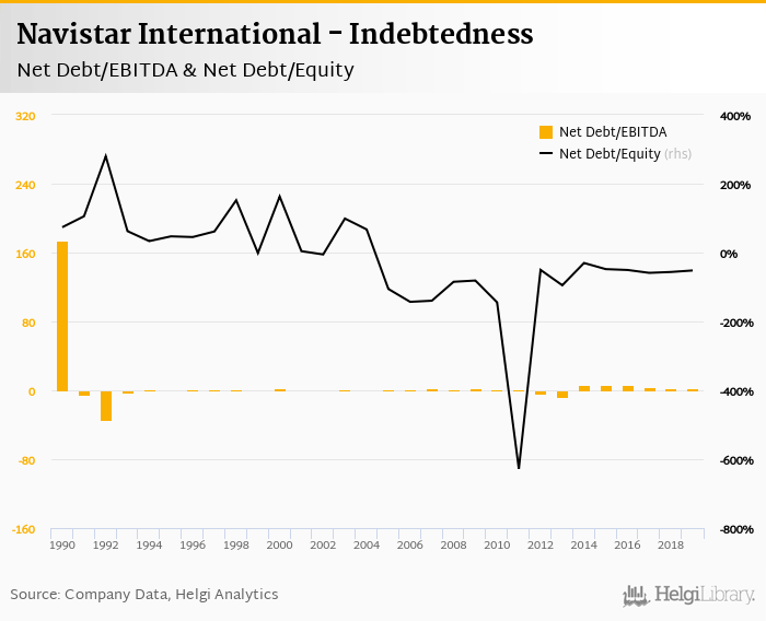 Navistar International's net debt stood at USD 1,944 mil and accounted for -52.0% of equity at the end of 2019. The ratio is up 4.42 pp compared to the previous year.