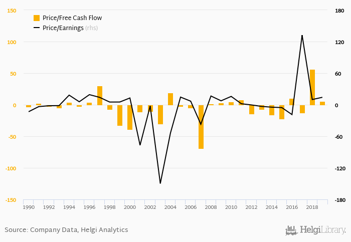 At the end of 2019, the firm traded at price to earnings of 14.1x. Over the last five years, this multiple achieved a high of 132x in 2017 and a low of -18.7x in 2016 with an average of 26.4x.