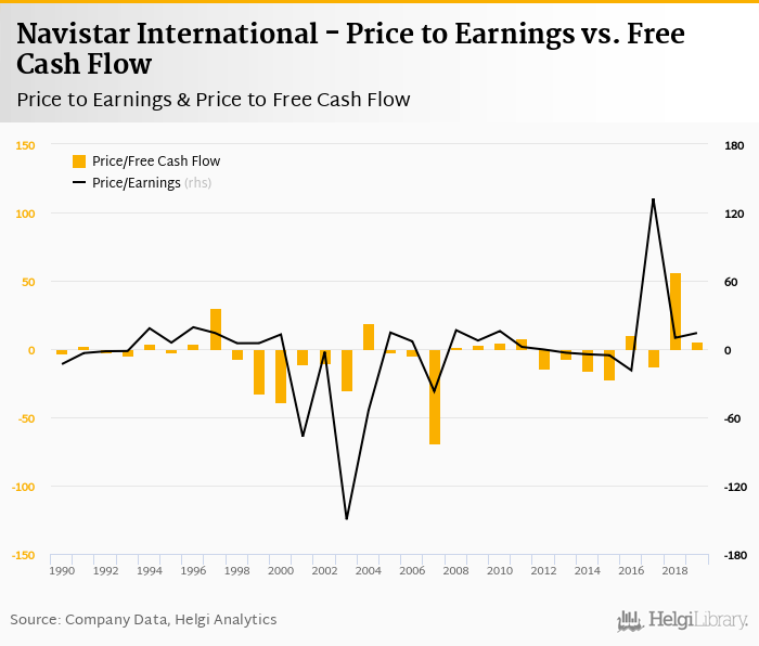 Regarding cash generated defined by the sum of net profit and depreciation, the stock traded at 8.68x at the end of 2019. When investments are excluded to get free cash flow, Navistar International traded at 5.25x.
