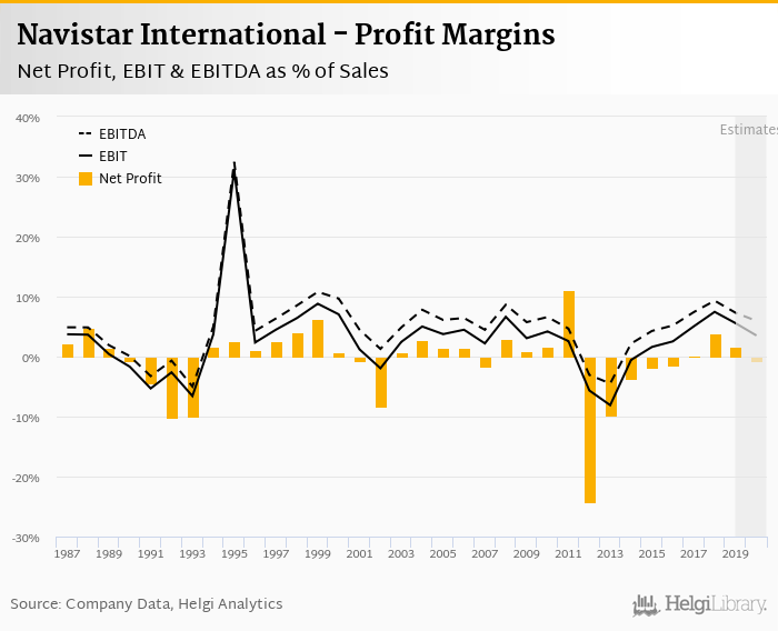 Navistar International made a net profit of USD 174 mil with revenues of USD 10,656 mil in 2019, down by 59.0% and down by 1.13%, respectively, compared to the previous year.