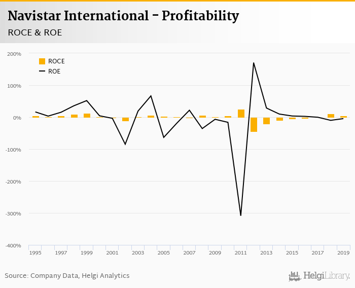 Navistar International made a net profit of USD 174 mil in 2019, down 59% compared to the previous year. Historically, between 1987 and 2019, the company's net profit reached a high of USD 1,576 mil in 2011 and a low of USD -2,980 mil in 2012.