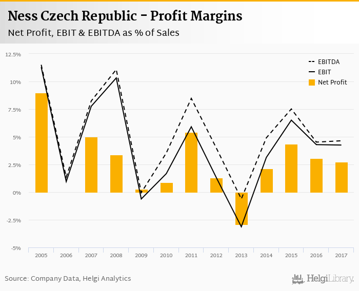 Ness Czech Republic made a net profit of CZK 25.1 mil with revenues of CZK 916 mil in 2017, down by 12.9% and down by 2.81%, respectively, compared to the previous year.